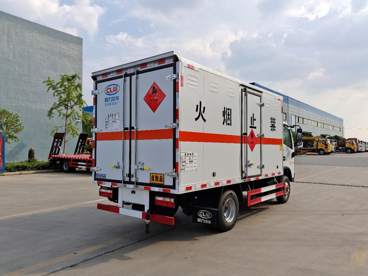 | 貨箱配置 | 廂體為雙層金屬骨架結構,外板采用冷軋鋼板,中間填充阻燃泡沫,內飾為鋁板。底板為平板上鋪防靜電膠皮。廂內兩側加裝固定貨物臥環,門框帶防盜報警器,頂部帶煙霧報警器,廂體右側選裝側門,隨車配2個滅火器,危險標志牌,防火帽,危險品三角頂燈。(也可用瓦楞板) | ||